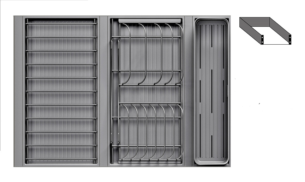 1 для столовых приборов (состоит из: 1 х емкость пластиковая 400 х 100 х 120 мм, 1 х поддон пластиковый 423 х 124 мм)
