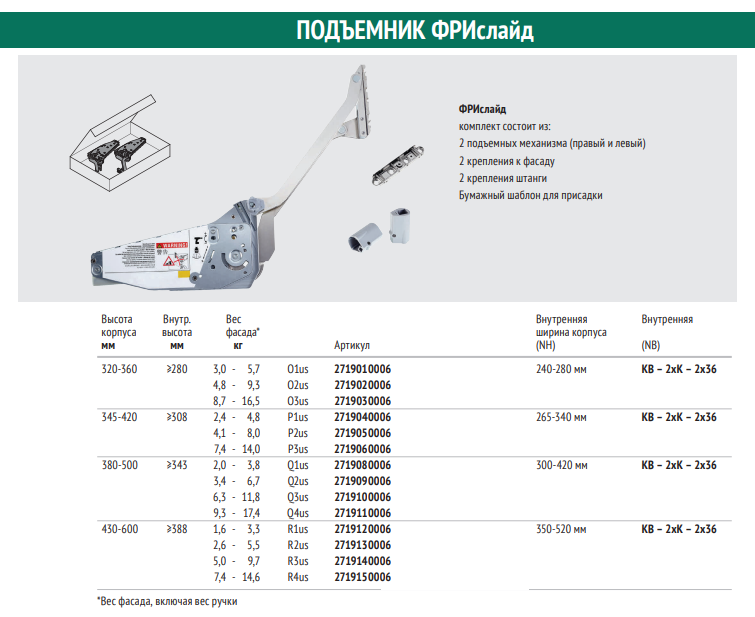 Комплект состоит из 2 подъемных механизмов (правого и левого), 2 креплений к фасаду и 2 крепежных втулок
